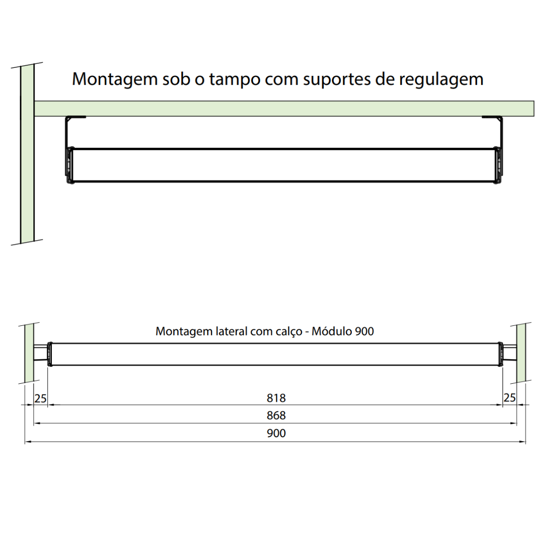 Observações: Disponível para módulos de larg. 600, 700, 800, 900 e 1000 mm, com profundidade mínima de 465 mm. Acompanha calços, suportes, parafusos e instruções para montagem inferior ou lateral. Varetas fornecidas desmontadas.
